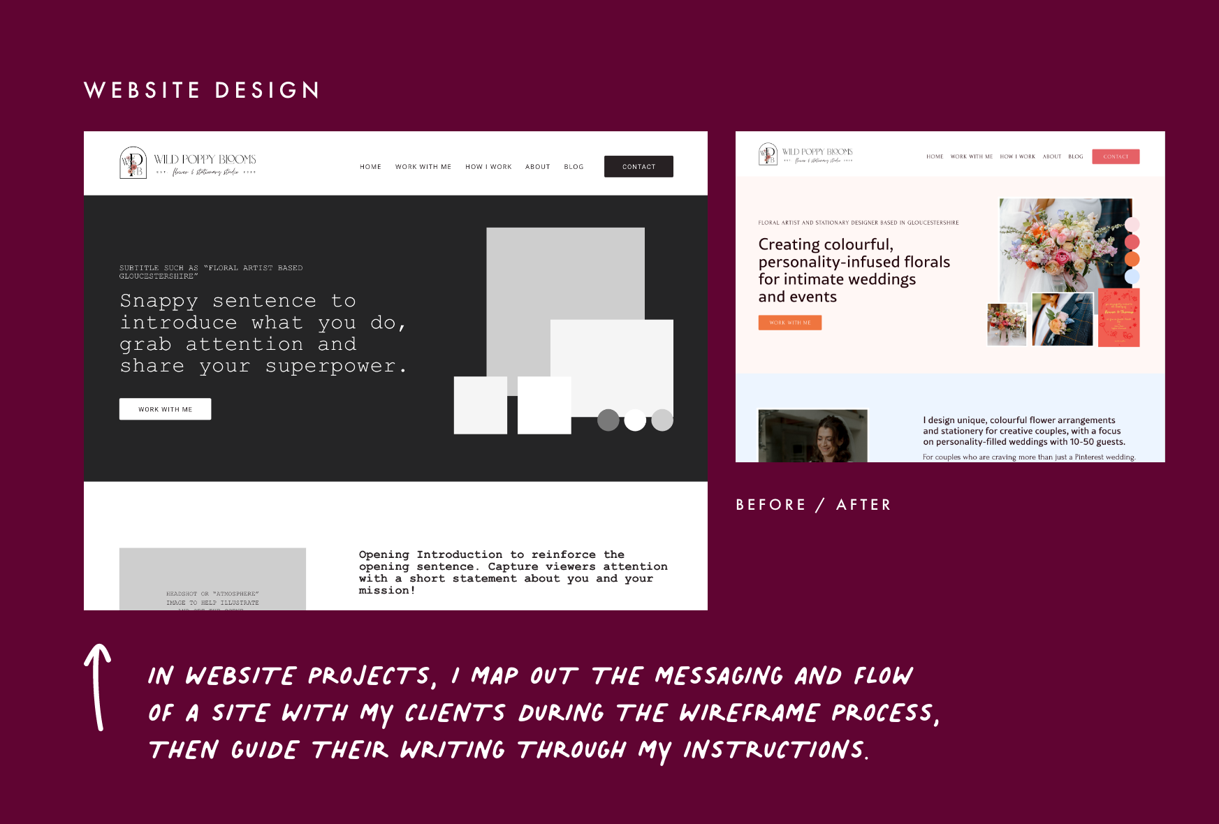 In website projects, I map out the messaging and flow of a site with my clients during the wireframe process, then I can guide their writing through my written instructions in the design.