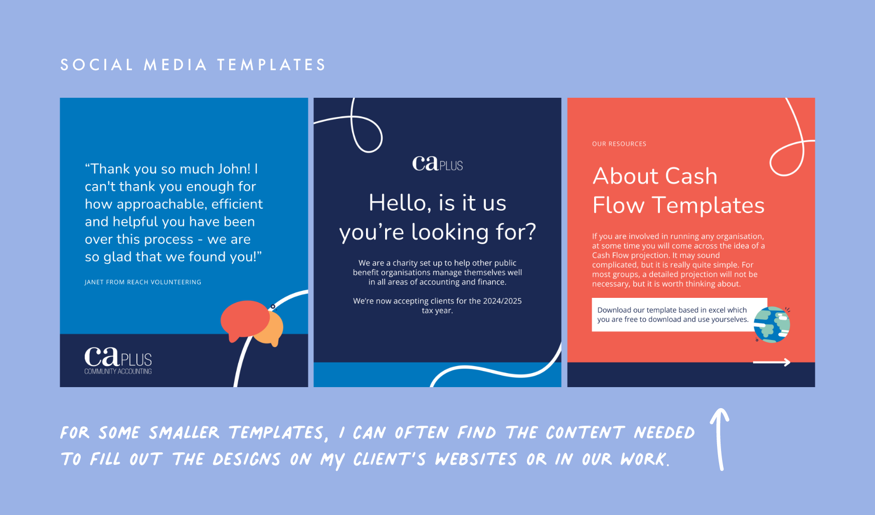 For some smaller templates, I can often find the content needed to fill out the designs - either from my client’s websites or in our work.